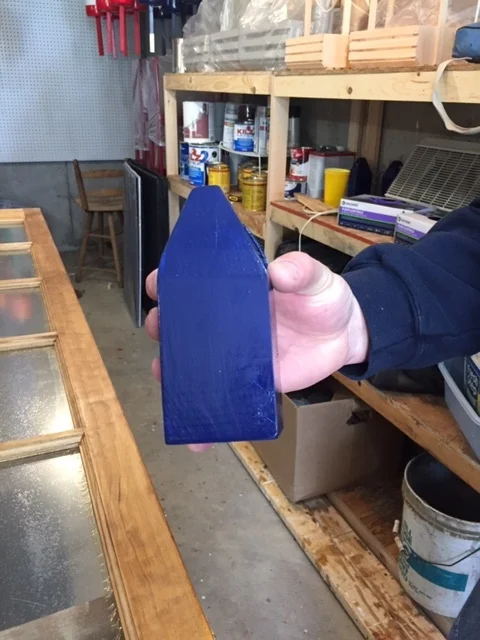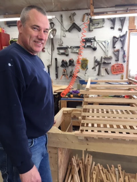 Howarth’s workshop sits in a building adjacent to his Kennebunkport home (and 15 feet from a neatly-stacked high woodpile that should keep the family warm through 2021, at least). With mounds of sawdust nestling beneath his table saw, it’s immediately apparent this is a working man’s shop. Piles of red oak and pine slats stand ready to be nailed together. The variety of tools hanging from a pegboard wall prove Howarth lacks nothing when he turns on the overhead lights in the 20x24 insulated shop and starts building.