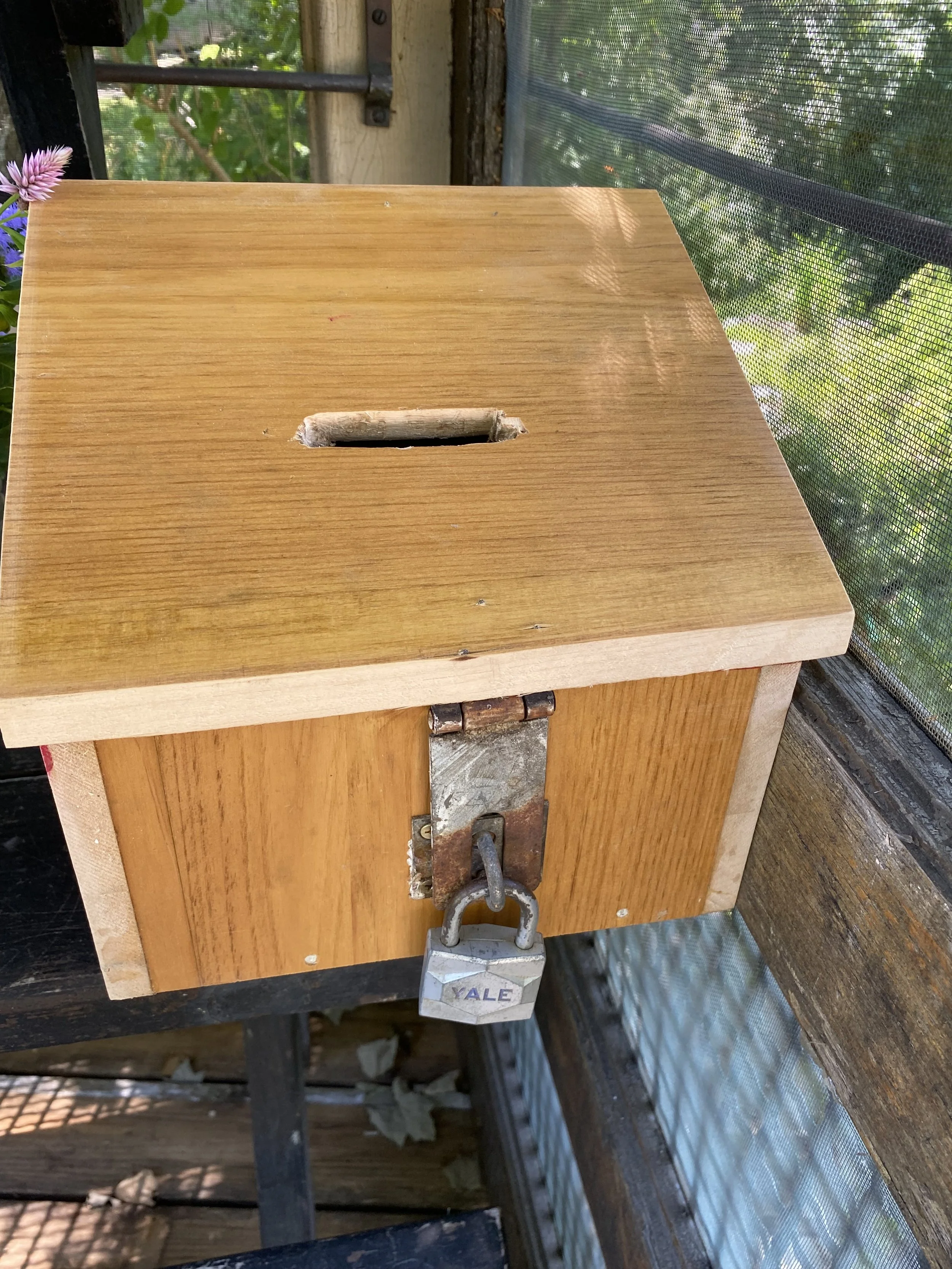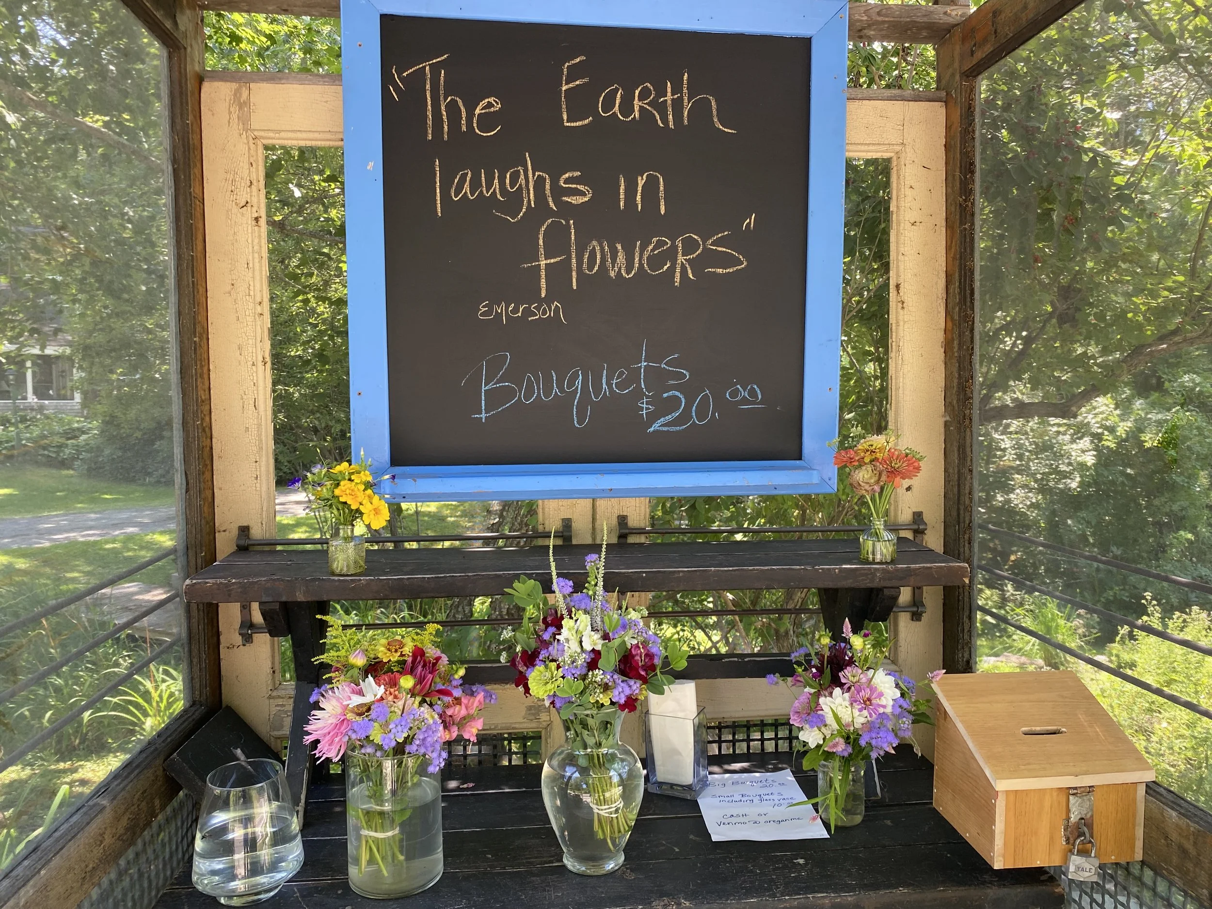 When I stopped to buy a small bouquet at Regan’s stand last week, I noticed that the “cash register” — a 14”x14” wooden box — featured a padlock. Hmmm, I thought. That’s new. Transactions have always been on the “honor system,” with customers placing a $10 or $20 bill in the box.