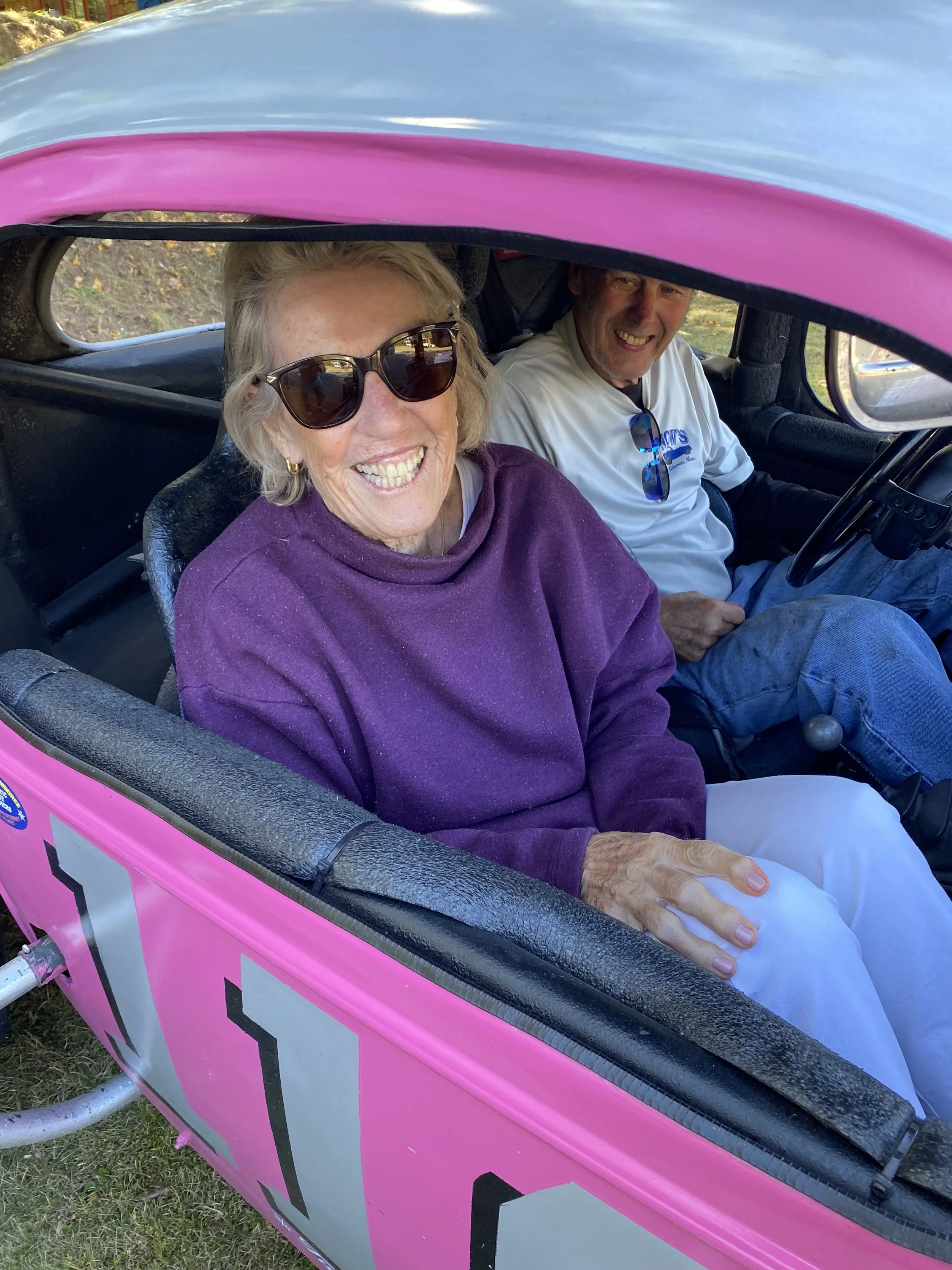 I told Curt that, at age 83, I never thought I’d do something like that. He said, “Well Val, you gotta meet Joy Jones — she’s 82 and she’s a race car driver.” Joy’s car had developed a brake leak so she was unable to race today but we chatted for a while about her career. (She also whispered that we were probably the oldest people there.)