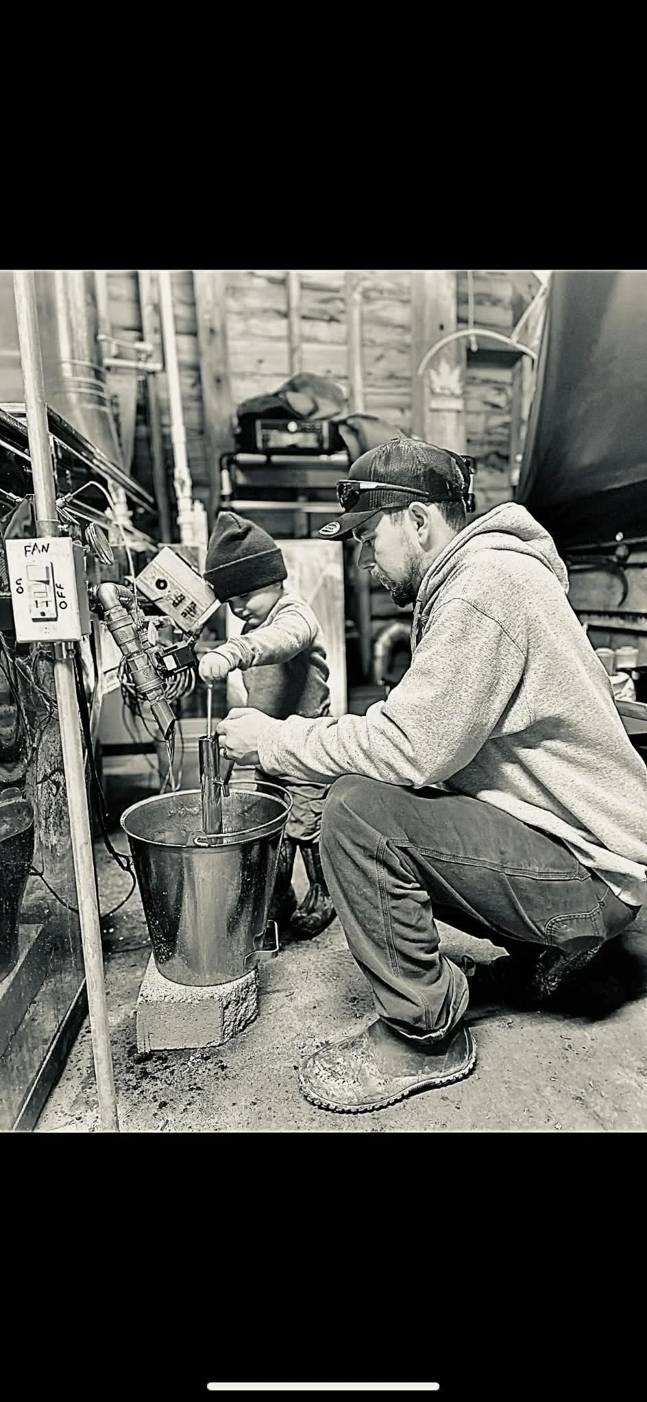 The art and craft of making maple syrup is a time-honored Spring tradition, captured in these photos of Mainer Casey Belanger and his young son Bo: a third generation sugar maker teaching a fourth generation sugar maker how to check the density of the finished maple syrup.